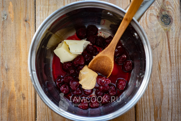 Готовим вишневый соус. В сотейник выложим вишни, сливочное масло, мед, горчицу, перец черный молотый.