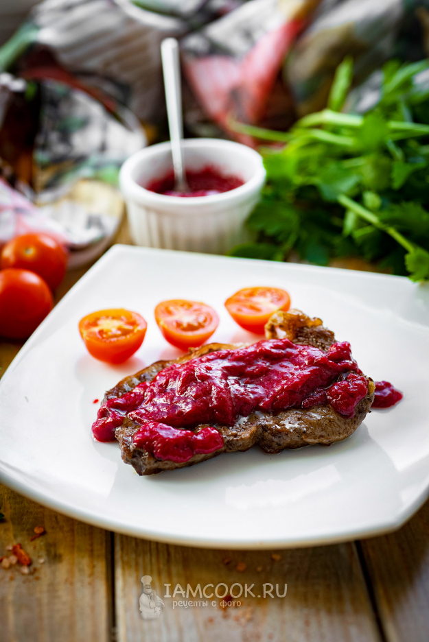 На порционную тарелку выкладываем стейк, поверх выкладываем обильно вишневый соус. Подаем говядину в вишневом соусе к столу. Приятного аппетита!