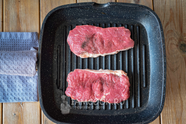 Поверхность сковороды-гриль (можно и на обычной жарить) смажем тонким слоем растительного масла, воспользовавшись силиконовой кулинарной кистью. Включим максимальный нагрев и выложим на сковороду говяжьи стейки, каждый чуть присыплем молотым черным перцем и солью. На максимальном огне будем обжаривать стейки с двух сторон до появления золотистых подпалин с обеих сторон.