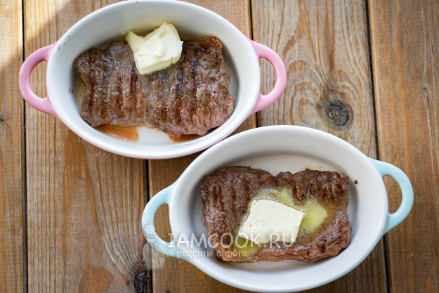 Обжаренные стейки выложим в форму для запекания. Я выложила в две маленьких формы. На каждый стейк положим по кусочку сливочного масла (15 г - один кусочек).