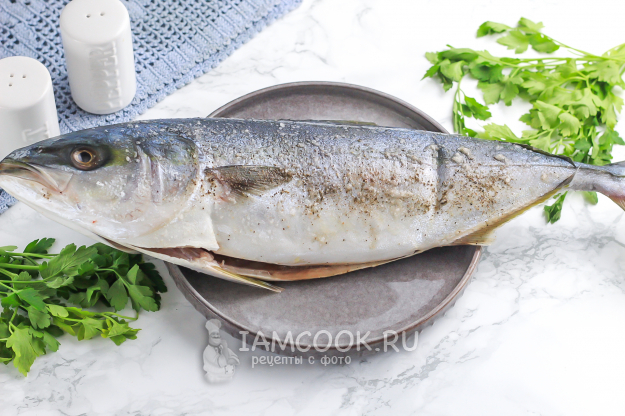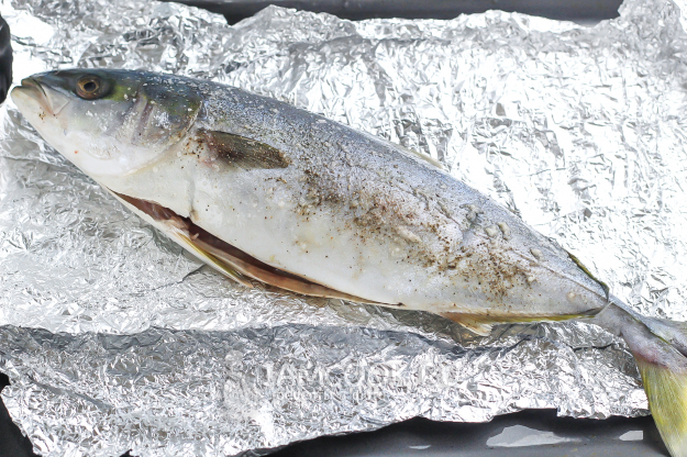 Рыбу слегка очистите от чешуи - в основном она на нижней половине тушки, на светлой. Вспорите брюшко и удалите внутренности. Также очистите брюшко от темной пленки и промойте рыбу внутри и снаружи. По желанию можете срезать и голову лакедры либо удалить из нее жабры.