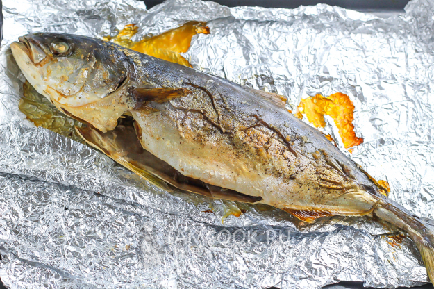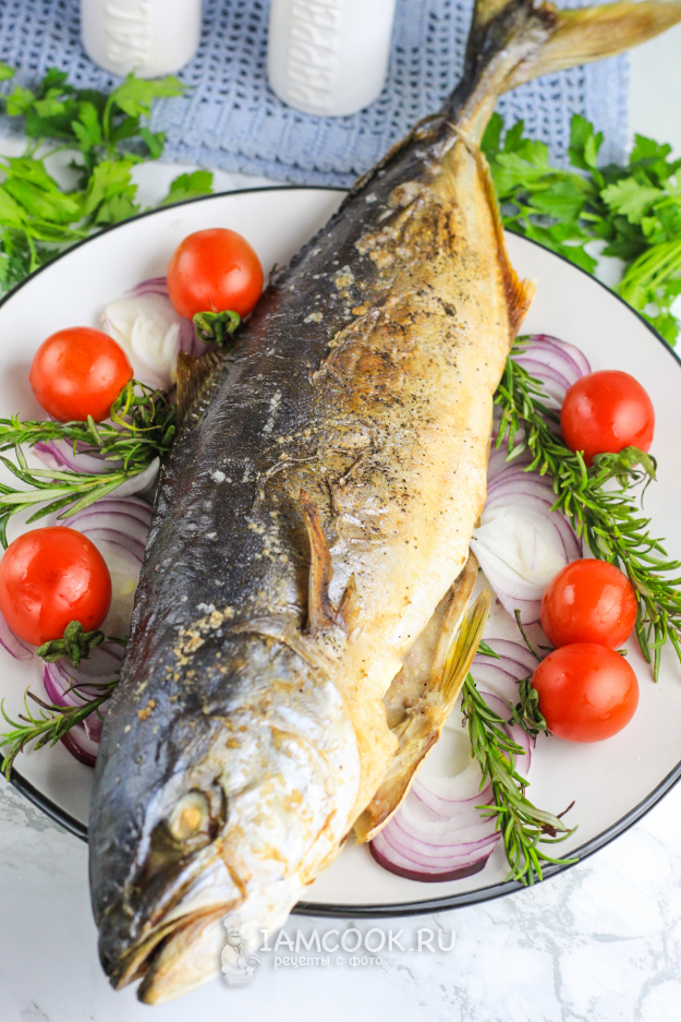 Проверьте тушку внутри на готовность и выключите нагрев. Запеченная в духовке лакедра готова к подаче на стол!