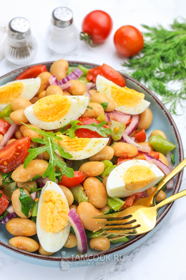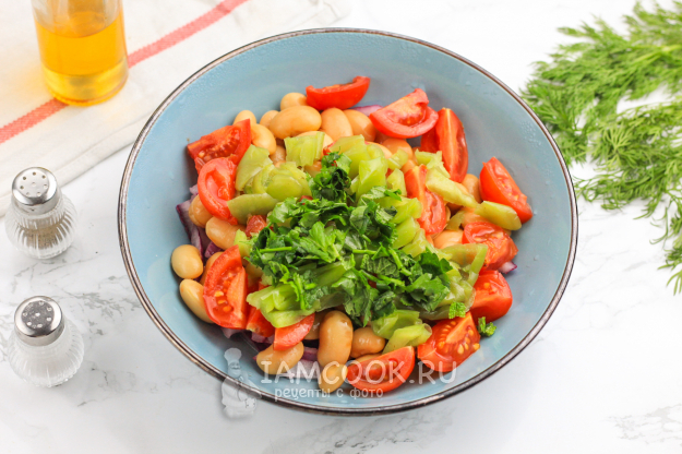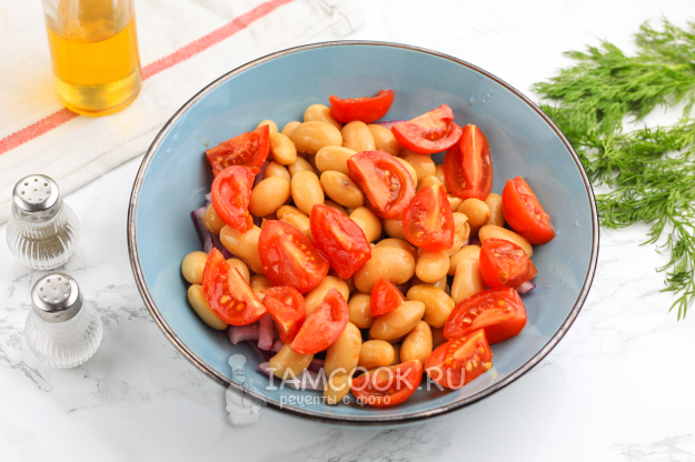Затем выложите в емкость отварную белую фасоль, нарезанные помидоры.