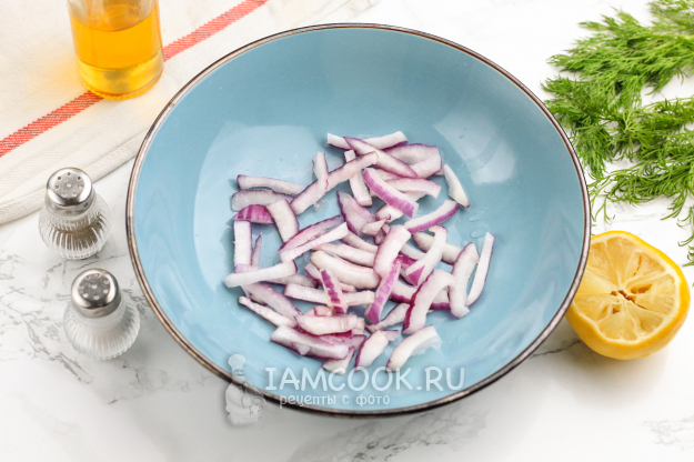 Лук нарежьте полукольцами и выложите в салатник или пиалу. Влейте лимонный сок и перемешайте, оставьте для маринования на 5 минут.