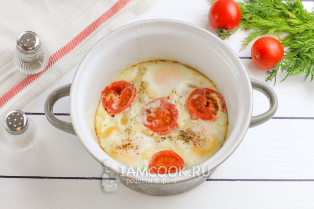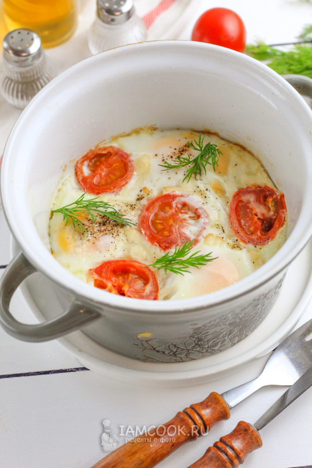 Украсьте готовую яичницу в горшочках свежей зеленью и подайте к столу с соусами, паштетами.