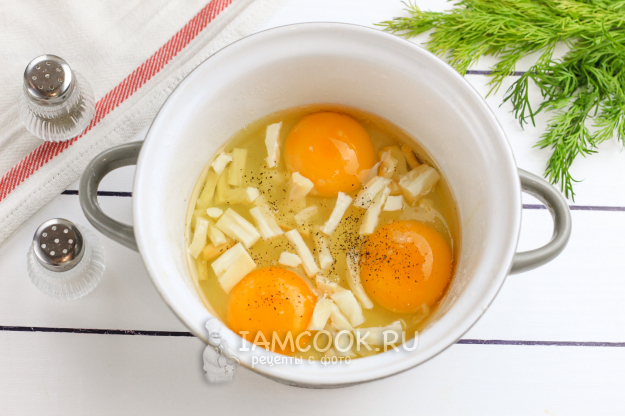 Первым делом смажьте горшочки растительным маслом внутри, иначе потом не сможете отделить яичницу от стенок. Вбейте куриные яйца, посолите их и поперчите. Если используете сыр сулугуни или другой рассольный сыр, то соль не добавляйте - сыр очень соленый.