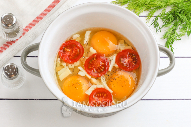 Поместите горшочки в духовку и только затем разогрейте ее до 200 градусов, чтобы емкость не лопнула от перепада температур. Готовьте яичницу в горшочках в духовке 15-20 минут, до плотности белков.