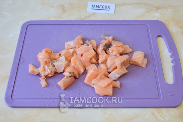 Лосося нарежьте небольшими кусочками, удаляя при этом все кости.