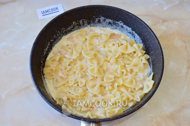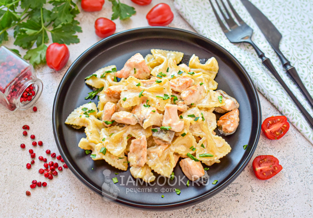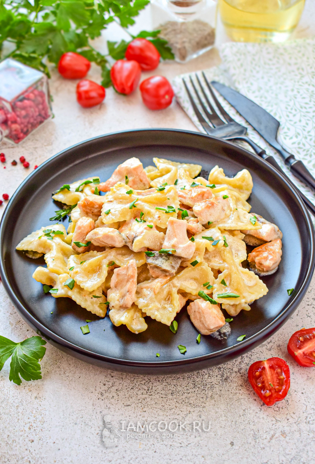 Фарфалле с лососем в сливочном соусе готовы! Разложите по тарелкам и подавайте к столу.