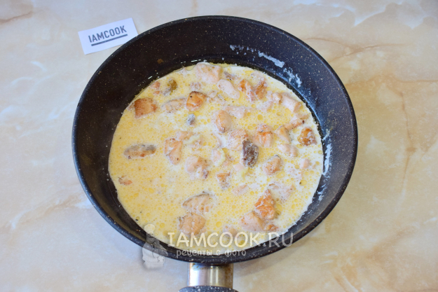 Затем влейте к рыбе сливки. Пропустите через пресс чеснок. По вкусу посыпьте солью и специями. Можно добавить готовые специи для рыбы. Доведите все до кипения.