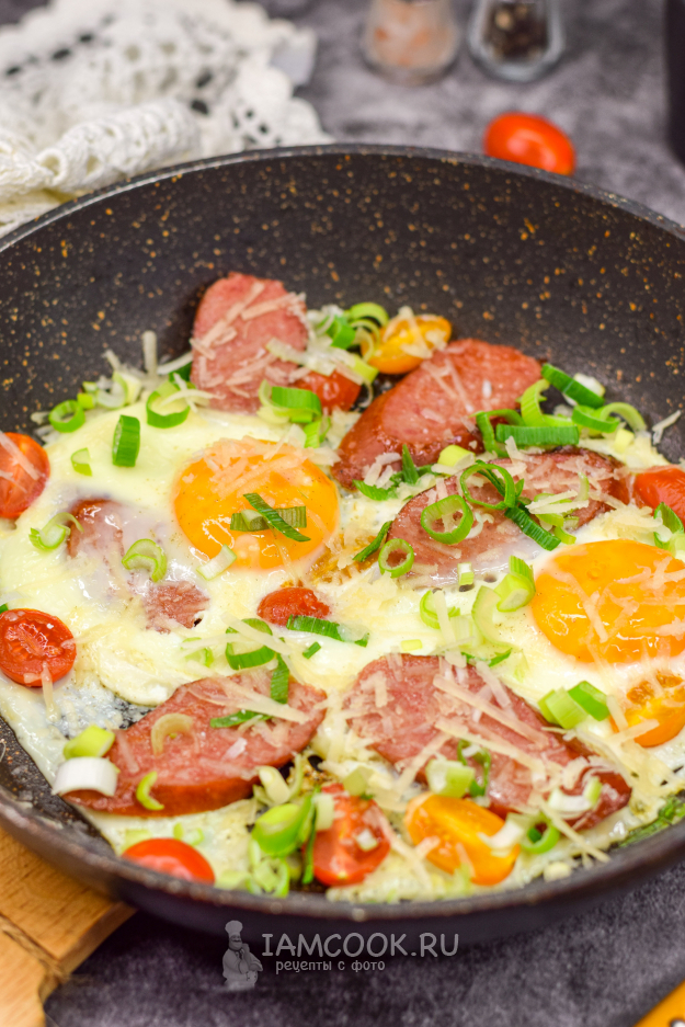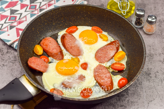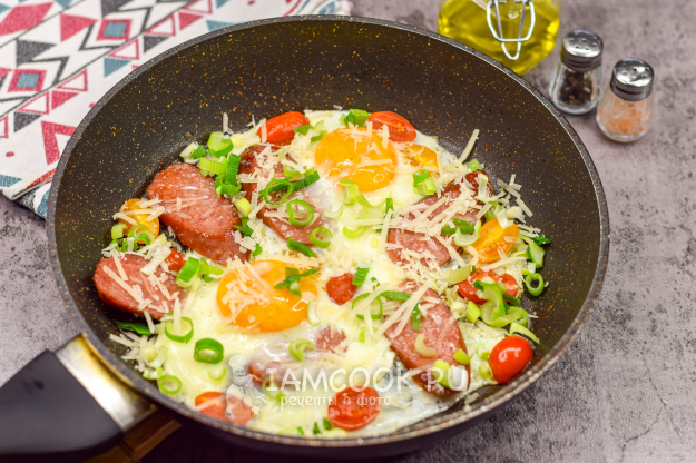 Соберите по списку продукты для приготовления яичницы с колбасой и сыром на сковороде.