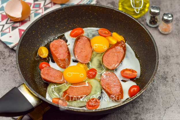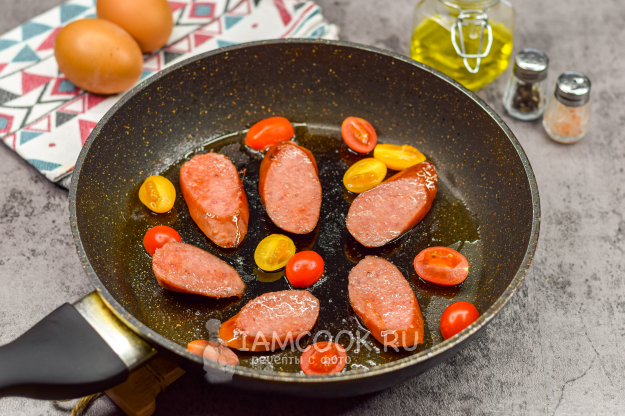 В сковороде разогрейте немного масла, выложите колбасу и помидоры. После поджарьте колбасу с каждой стороны по 2 минуты.