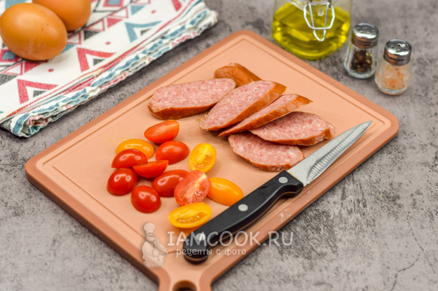 Колбасу нарежьте крупными кусочками. Томаты черри ополосните и просушите, после разрежьте томаты пополам.