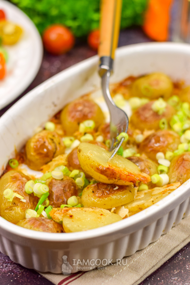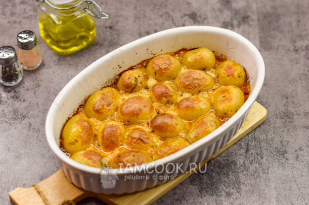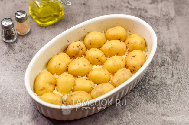После смажьте форму для запекания оливковым маслом, выложите весь сыр. Поверх сыра разложите по половинке картофеля срезом вниз.