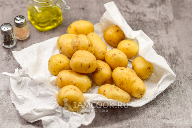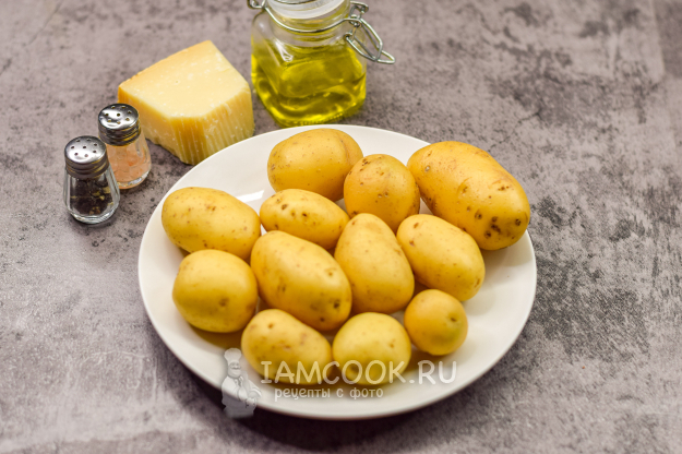 Подготовьте по списку продукты для запекания картофеля с пармезаном в духовке. Картофель выбирайте не сильно крупного размера, подойдут небольшие клубни.