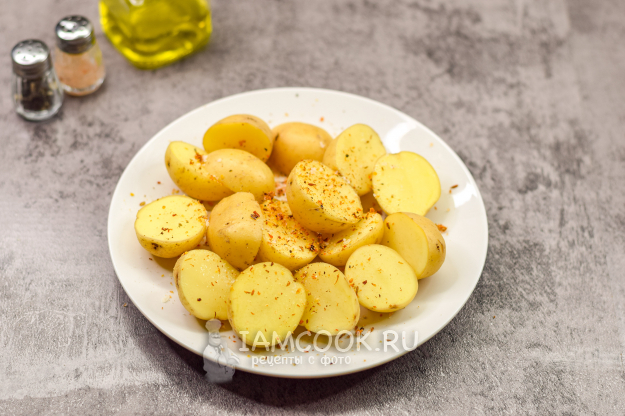 Каждую картофелину разрежьте пополам, посыпьте солью, перцем, любимыми специями.