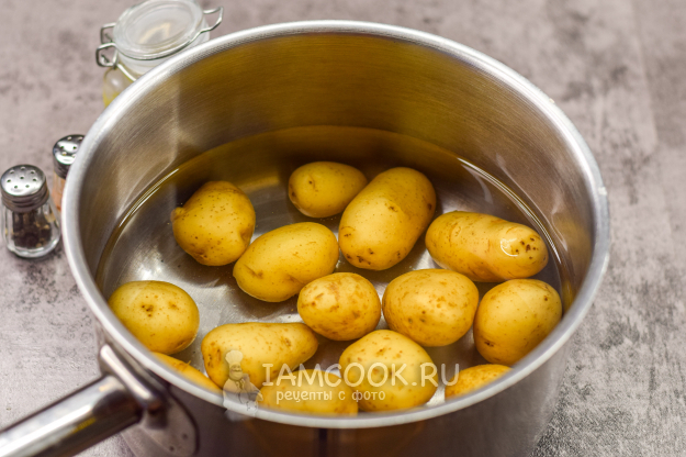Картошку хорошо вымойте и переложите в кастрюлю, залейте кипятком и оставьте на 15 минут.