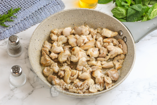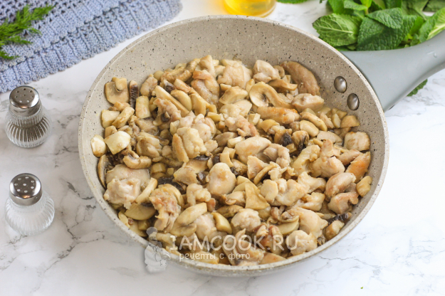 Первым делом промойте курицу и отделите мякоть от костей, нарежьте ее на части. Обжарьте кусочки курицы в растительном масле на сковороде примерно 5-8 минут. Затем промойте грибы и нарежьте их небольшими кубиками. Добавьте в емкость к курице и всыпьте 2 щепотки соли и перец. Перемешайте и прожарьте еще 5-8 минут до румяности. Сначала нужно выпарить жидкость, выделившуюся из грибов, а затем поджарить.