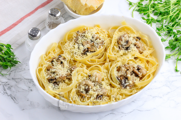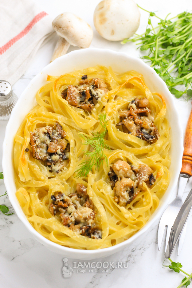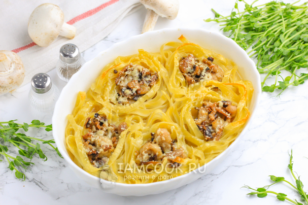 Запеките макароны-гнезда с курицей и грибами в духовке примерно 5-10 минут, до румяности и выпаривания жидкости.