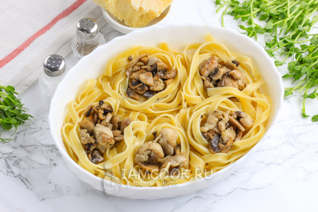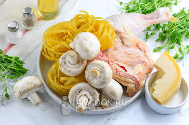 Продукты для приготовления макарон-гнезд с курицей и грибами в духовке - перед вами!