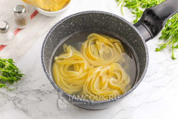Вскипятите воду в сотейнике или ковше, кастрюле. Выложите в кипящую воду макароны-гнезда и отварите примерно 8-10 минут. Это нужно сделать обязательно, так как в духовке макароны не отварятся так хорошо.