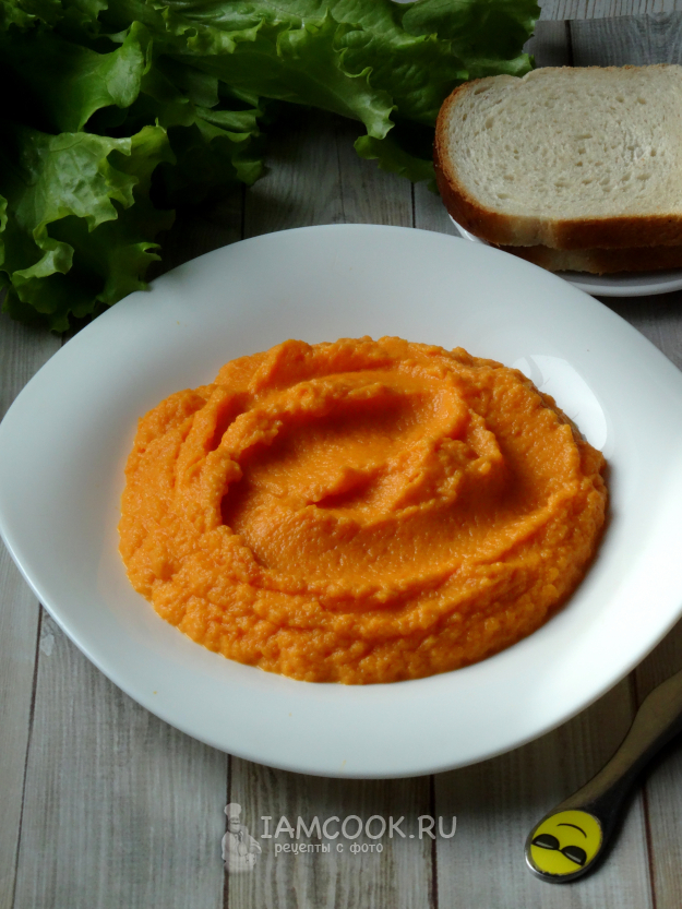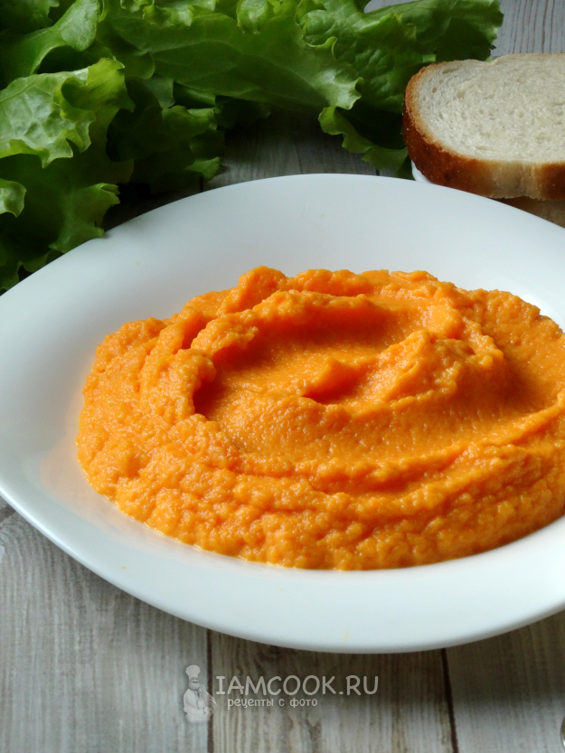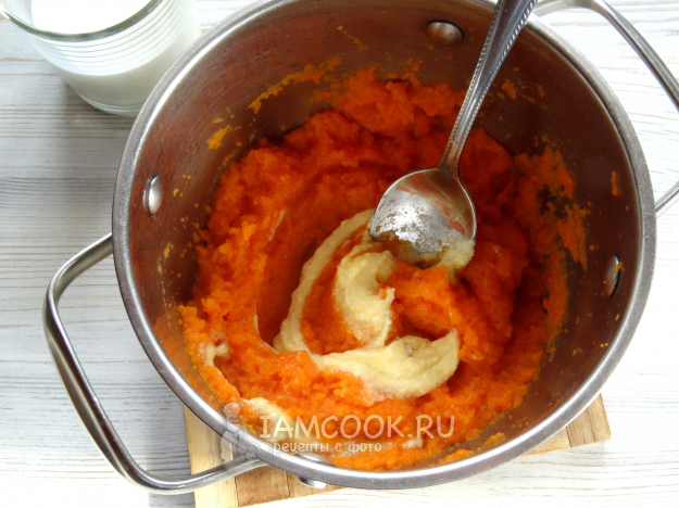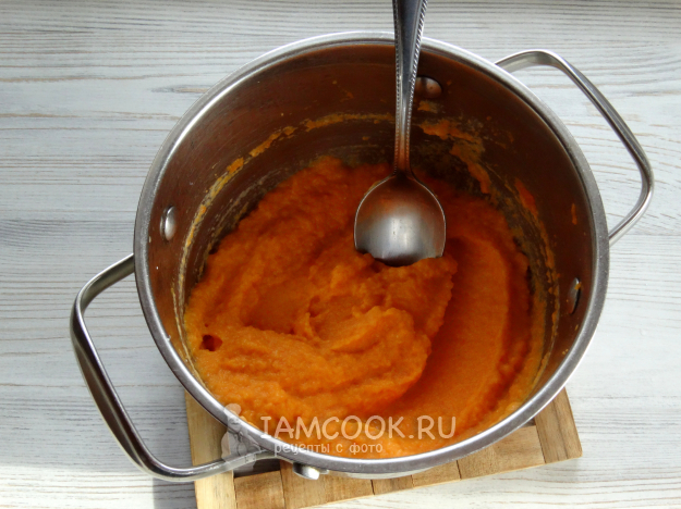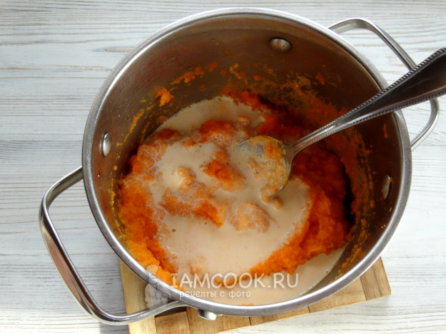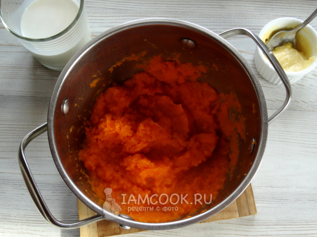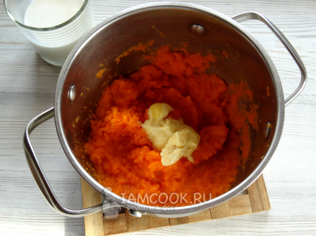 Размять морковь в пюре, удобнее это делать погружным блендером.