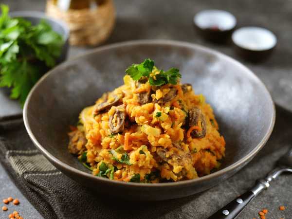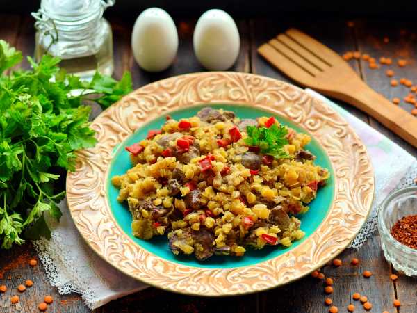 Переложите овощи и курицу со сковороды в жаропрочную форму, после добавьте чечевицу. Перемешайте все.