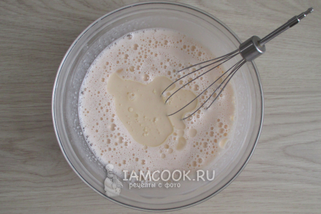 Соедините яйца, сахар и соль. Перемешайте и слегка взбейте.