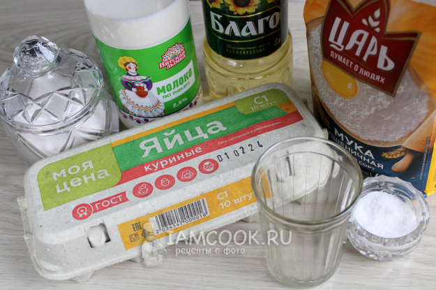 Для тонких блинчиков «Три стакана» подготовьте ингредиенты по списку к рецепту. Жирность молока не принципиальна, например, возьмите обычное - 2,5-3,4%. Если яйца крупные, отборные С0, то хватит двух, если мелковатые С2, то 3 штуки. Попробуйте по случаю оба варианта - для разнообразия на ровном месте.