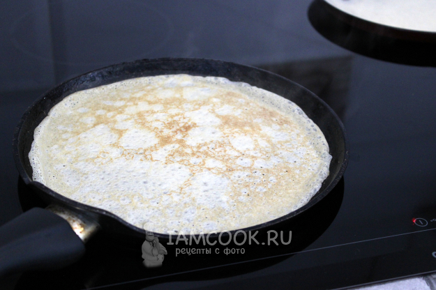 Пеките блины обычным способом: на разогретую до подходящей температуры сковороду наливайте порцию жидкого теста, после подсыхания краёв переворачивайте блин, чтобы поджарить с другой стороны. Подходящая температура подбирается так, чтобы жидкое блинное тесто не кипело при наливании, а спокойно растекалось при покачивании сковороды. Все плиты разные: на моей новой Горенье устанавливаю 7 из 9, на прежней Ханзе варьировала 6-7 из 9, на одноконфорочной индукционной Китфорт пеку на 800-1000 из 1800 и т.д.