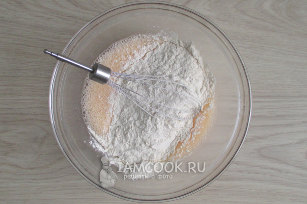 Влейте молоко. Видела рекомендации, что оно должно быть комнатной температуры, но я всякое вливала, вроде и не принципиально. Перемешайте. Добавьте муку всю сразу или порциями, желательно её просеять.