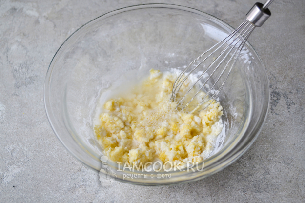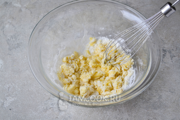 В миску насыпьте рисовую муку, разбейте яйцо, добавьте сахар и соль.