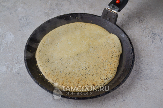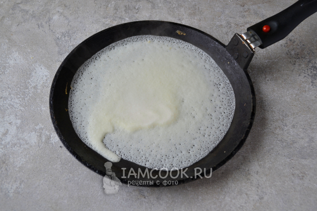 Раскалите сковороду. Перед выпечкой блина смажьте сковороду растительным маслом и налейте порцию теста тонким слоем. Перед выпечкой каждого следующего блина перемешивайте тесто, так как рисовая мука оседает на дно миски.