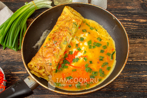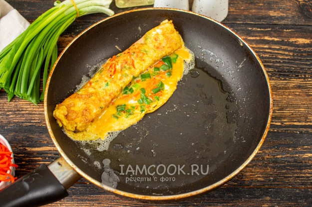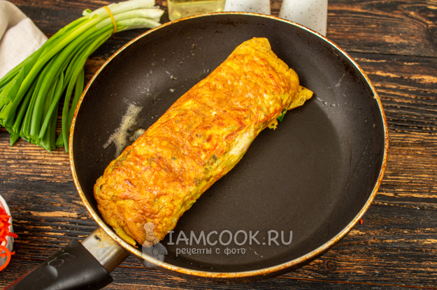 Когда омлет будет практически готов, аккуратно сверните его в рулет с помощью лопатки. Отодвиньте омлет на край сковороды.