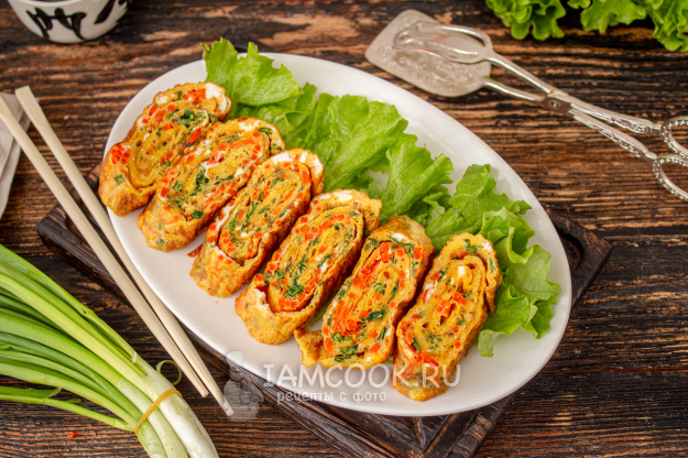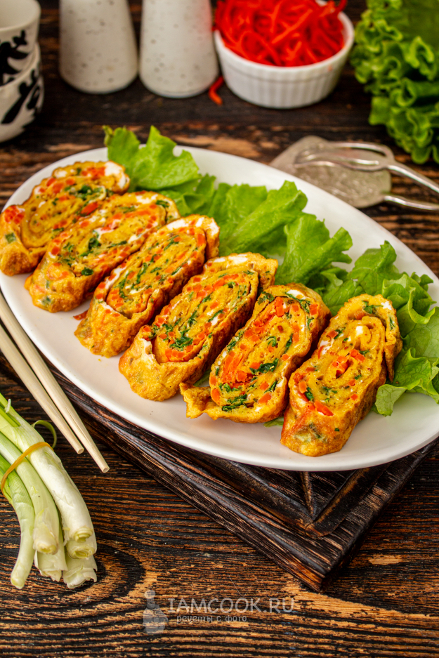 В результате должен получиться плотный рулет из омлета. Аккуратно переложите его на разделочную доску и нарежьте на порционные кусочки шириной 2 см. Готовый омлет по-корейски подавайте в горячем виде, украсив свежей зеленью.