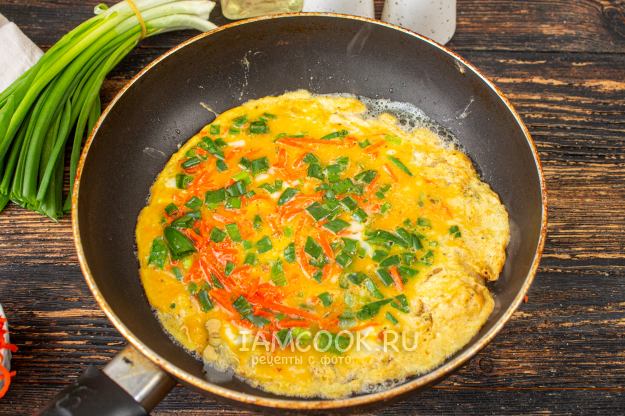 Зеленый лук мелко нарежьте, также измельчите морковь по-корейски. Добавьте их к яйцам, перемешайте.