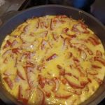 Сковороду смажьте растительным маслом, поставьте на небольшой огонь и разогрейте. Выложите полоски лаваша и равномерно залейте их яичной смесью.