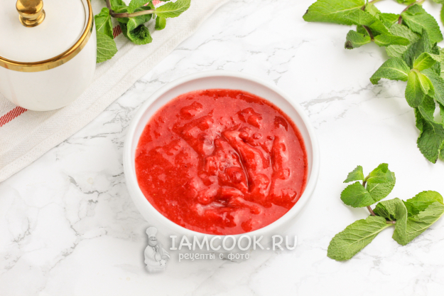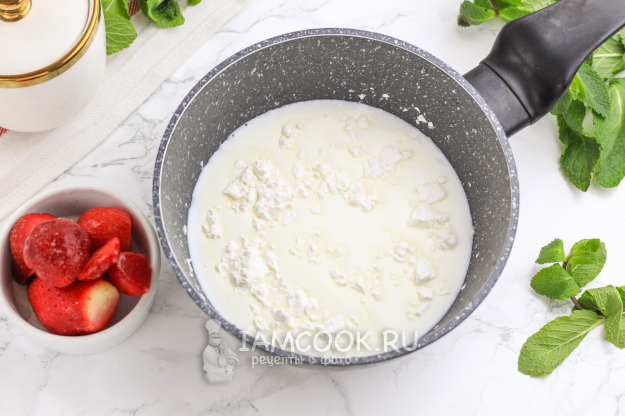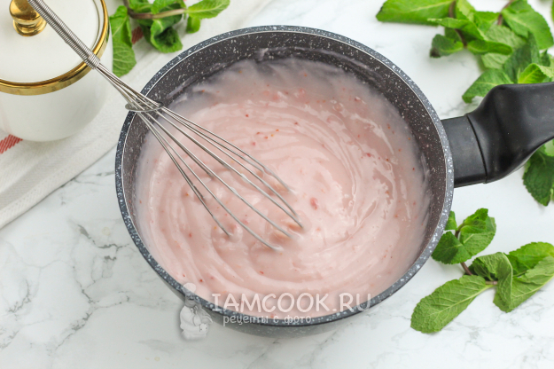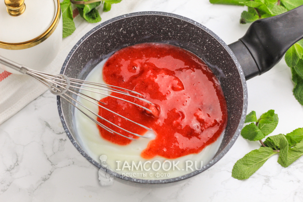 Добавьте клубничное пюре в крем и верните емкость на плиту. Проварите еще 1-2 минуты и выключите нагрев.