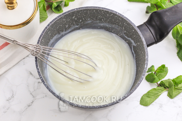 Поместите емкость на плиту, включив средний нагрев. Помешивая венчиком, заварите крем до легкой густоты и выключите нагрев.