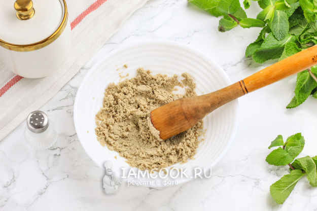 Поместите емкость на плиту, включив умеренный нагрев. Пока масса прогревается, растолките халву в пиале до мелкой крошки.