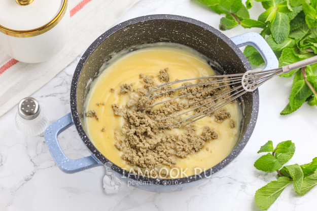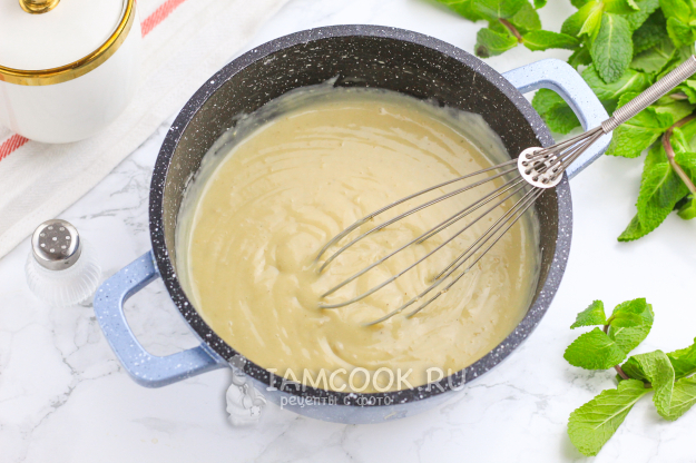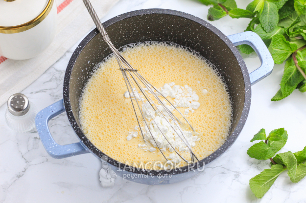 Тщательно взбейте всё венчиком и перемешайте. Всыпьте кукурузный крахмал и вмешайте его в холодную жидкость. Именно в холодную, так как крахмал в горячей жидкости сразу же взбивается в комочки.