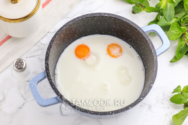 Куриные яйца разбейте и разделите их на желтки и белки. Выложите желтки в казан или ковш с антипригарным дном, влейте молоко любой жирности, всыпьте сахар, соль, ванильный сахар.