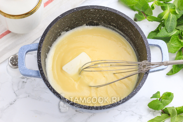 Не переставая перемешивать, заварите крем до легкой густоты и добавьте в него сливочное масло. Выключите нагрев и вмешайте масло в крем.