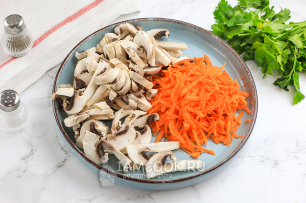 Морковь натрите на терке с мелкими ячейками, а грибы нарежьте ломтиками.