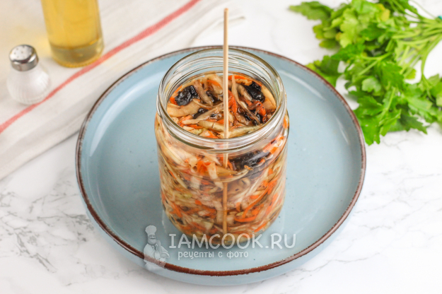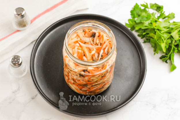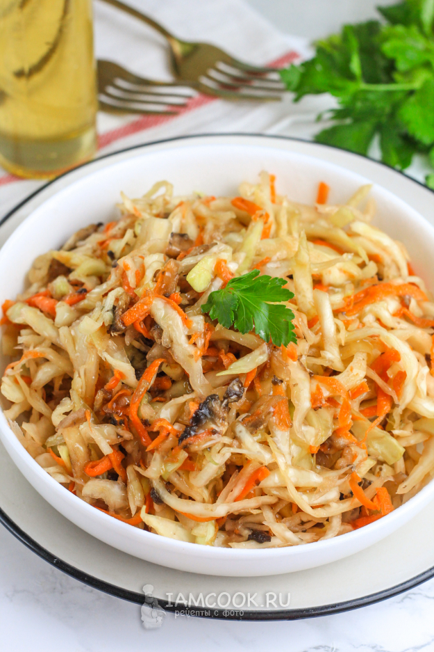 Спустя указанное время квашеная капуста с грибами будет полностью готова! Откиньте ее на дуршлаг и промойте холодной водой. Затем отожмите от лишней жидкости и заправьте растительным маслом по вкусу. Выложите в пиалу или салатник и подайте к столу.