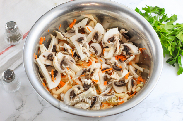 Добавьте грибы и перемешайте. Оставьте на 20 минут, чтобы и грибная нарезка выпустила сок.