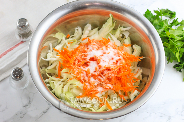 Морковь добавьте к капусте и всыпьте соль. Тщательно перетрите руками, чтобы нарезки выпустили сок.