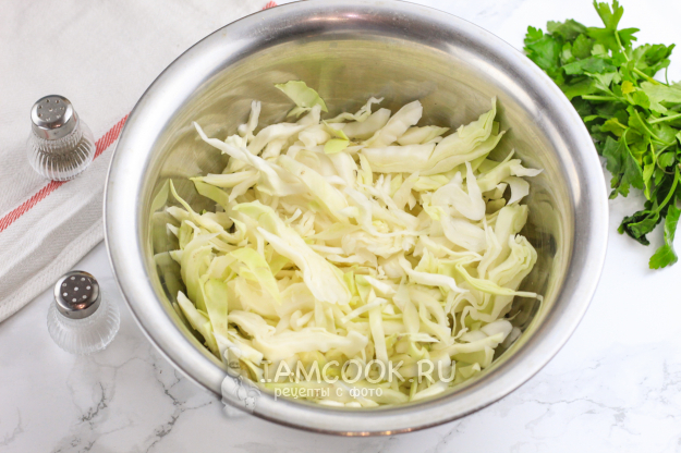 Снимите верхние листья с части вилка капусты и нарежьте его крупными лентами, а кочерыжку удалите. Выложите нарезку в миску или салатник.
