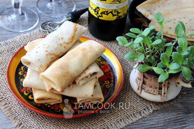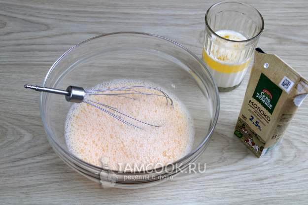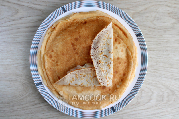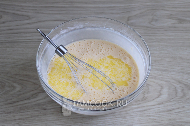 Половину или треть молока нагрейте вместе с куском сливочного масла, чтобы оно расплавилось. Для блинного теста соедините и перемешайте яйца с солью, сахаром, остальным молоком и водой.