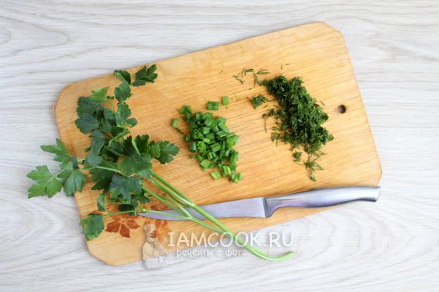 Свежую зелень порубите.